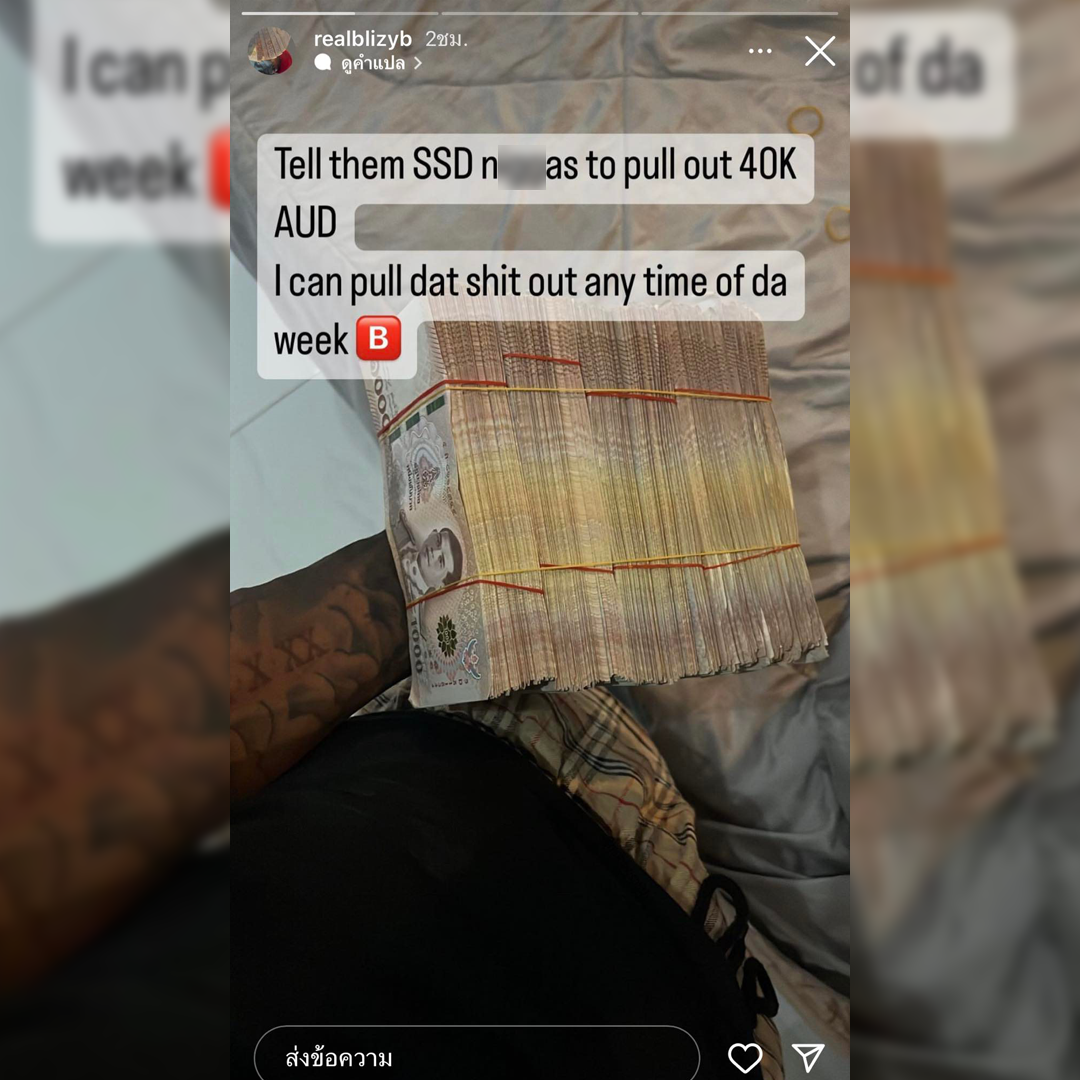 เมื่อวันที่ 24 พ.ย. 2565 | BLIZYB แรปเปอร์ AU (ออสเตรเลีย) ที่ย้ายมาอยู่ที่ไทยโพสต์ภาพเงินไทยจำนวนประมาณ 1 ล้านบาท หรือ 40K AUD พร้อมข้อความที่กล่าวถึง "SSD" หรือ "SouthSide Australian Brisbane" แก๊งคู่อริที่อยู่ฝั่ง AU ว่า
