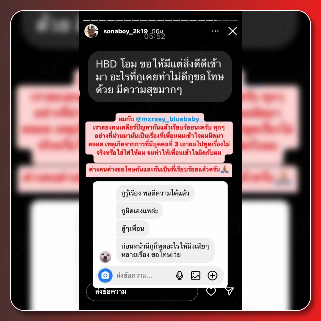 โดย SONABOY โพสต์ภาพ Artwork ของการร่วมงานของทั้งสอง ที่เผยว่าจะมาในเร็ว ๆ นี้ พร้อมกับโพสต์ภาพเหตุการณ์การสนทนาของการดีกันของพวกเขาทั้งสอง SONABOY และ MXRSEY ที่มีสาเหตุการทะเลาะกันมาจากการเข้าใจผิดโดยบุคคลที่ 3