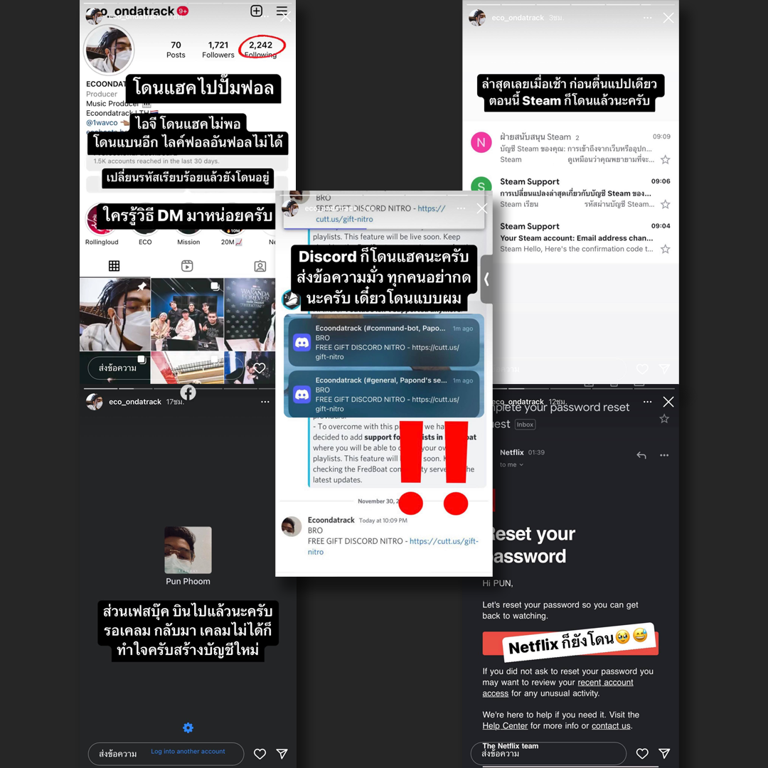 ซึ่งในจังหวะนั้น Hacker รายนี้ก็ได้เข้าชิง Accout IG ของเขาดำเนินการปั๊มยอด Follow จนโดนแบน และไล่ Unfollow คนไปทั่ว และมาต่อที่ Facebook ส่วนตัวของเขาที่ถูกทำให้บินไปในที่สุด ตามมาด้วย Steam (โปรแกรมเล่นเกม) และ Netflix ก็ไม่เว้น (ไม่รู้มันเอาไปทำไม ดูหนังงี้ ?) และตามมาด้วย Discord