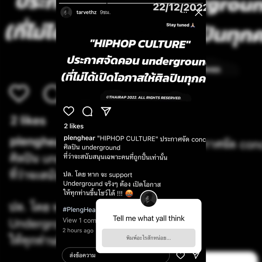 ซึ่งตรงนี้มันทำให้เป็นประเด็นให้เพจ PLENG HEAR TH เพจในเครือของ THAIRAP OFFICIAL GLOBAL (IG) ที่ก่อตั้งขึ้นมาเพื่อ Support ศิลปิน Underground แบบฟรีจับมาตั้งประเด็นพูดถึงในวันที่ 12 ธ.ค. ที่ผ่านมา ว่า
