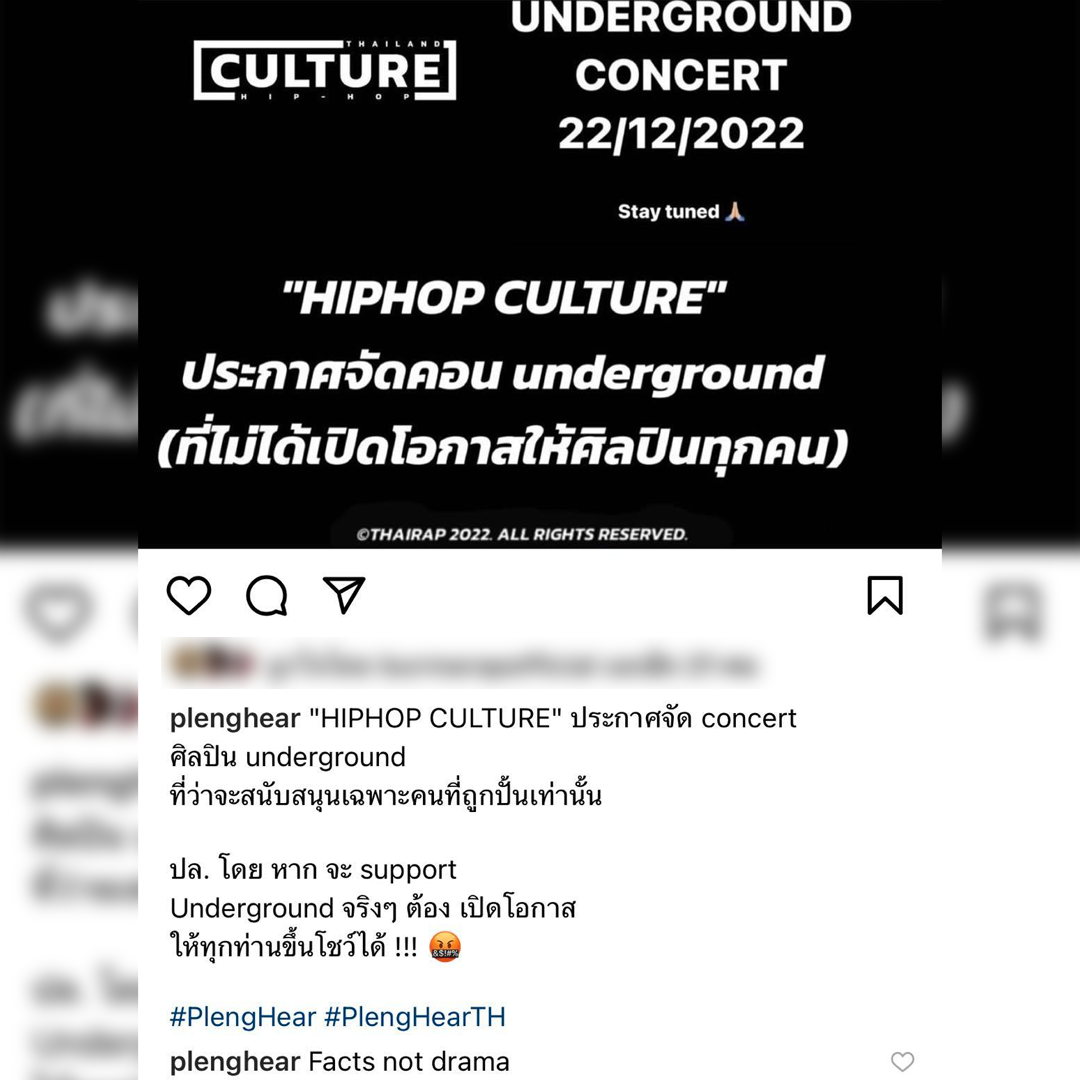 ซึ่งเราก็ไม่สามารถบอกได้ว่า HIPHOP CULTURE TH นั้นจะเอาศิลปิน Underground มาทุกคนหรือไม่ทุกคนอย่างที่ PLENG HEAR TH พูดหรือเปล่า เพราะ HIPHOP CULTURE TH บอกเพียงแค่ ชื่องานและวันจัดงานเท่านั้น แต่ด้วยความที่มันเป็นคำว่า "Underground" นี่แหละ มันจึงไปกระตุกต่อมความรู้สึกของ PLENG HEAR TH เพจที่ Support Underground โดยแท้จริงที่เรียกได้ว่าทุกคนจริง ๆ ">