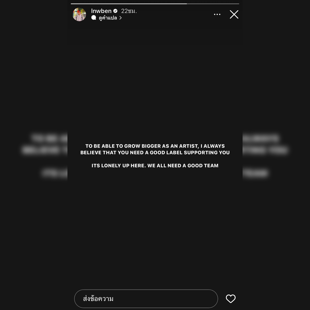 ซึ่งไม่มั่นใจว่านี่เป็นข้อคิดที่อยากฝากถึงศิลปินหรือสิ่งที่เขาสนใจแต่เขานั้นได้ทำการโพสต์ข้อความผ่าน IG Story ว่า "TO BE ABLE TO GROW BIGGER AS AN ARTIST, I ALWAYS BELIEVE THAT YOU NEED A GOOD LABEL SUPPORTING YOU ITS LONELY UP HERE. WE ALL NEED A GOOD TEAM" หรือก็หมายถึง "การที่ศิลปินจะเติบโตได้,เราเชื่อเสมอว่า คุณจำเป็นต้องมีค่ายดี ๆ คอยสนับสนุนคุณ ที่อยู่คนเดียวในตอนนี้. พวกเราต้องมีทีมดี ๆ สิ"