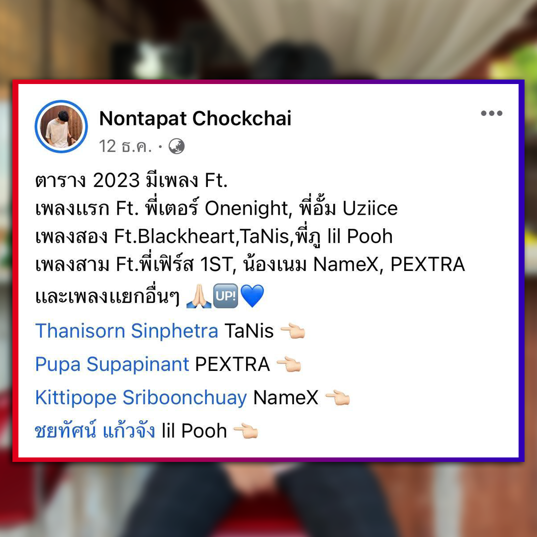 ซึ่งเขามาในครั้งนี้พร้อมเผยผลงาน Feature ในปี 2023 พร้อมคอนเฟิร์มจากผู้ร่วมจริงว่ามาแน่นอนอย่าง 1ST , BLACKHEART 2 ศิลปินแรปชื่อดังจาก DIEOUT Onenight , Uziice , TaNis , lil Pooh , NameX และ PEXTRA โดยเจ้าตัวเผยว่าผลงานนี้จะเริ่มมาในช่วงเดือน ม.ค. - ก.พ. 2023 และผลงานจะออกมาหน้าตาเป็นยังไงต้องรอติดตามกันได้เลย ที่มาของข่าว : https://www.facebook.com/...