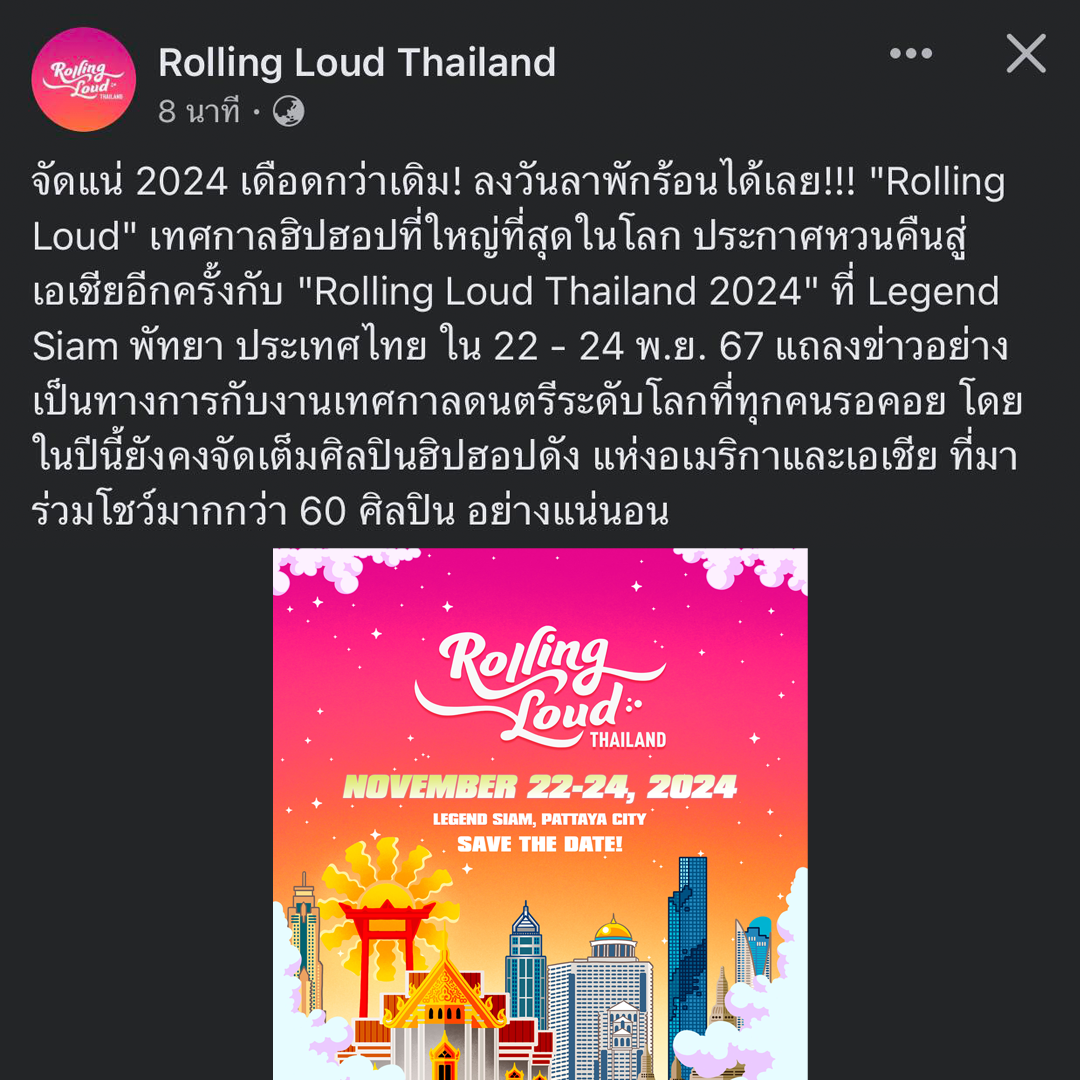 ประกาศอย่างเป็นทางการแล้ววันนี้ ROLLING LOUD THAILAND 2024 จะถูกจัดขึ้นที่ Legend Siam พัทยา ประเทศไทย ในวันที่ 22 - 24 พ.ย. 2567 พร้อมศิลปินฮิปฮอปชื่อดังกว่า 60 ชีวิตแน่นอน !