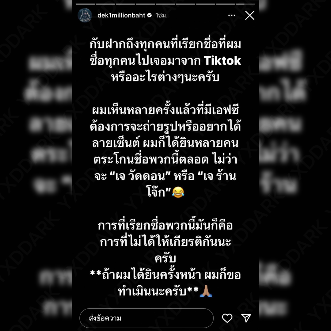 ซึ่ง "เจ" คือชื่อเล่นของเขาและ 1MILL คือ AKA ที่เขาตั้งขึ้นหากแต่บางคนก็ชอบเรียกชื่อที่ไม่ใช่ชื่อที่เขาตั้งขึ้น จนเขาต้องมาออกมาพูดพร้อมกับความรู้สึกเคือง ๆ ว่า "กับฝากถึงทุกคนที่เรียกชื่อที่ผม ชื่อทุกคนไปเจอมาจาก Tiktok หรืออะไรต่างๆนะครับ ผมเห็นหลายครั้งแล้วที่มีเอฟซี ต้องการจะถ่ายรูปหรืออยากได้ ลายเซ็นต์ ผมก็ได้ยินหลายคน ตระโกนชื่อพวกนี้ตลอด ไม่ว่า จะ “เจ วัดดอน" หรือ "เจ ร้าน โจ๊ก" การที่เรียกชื่อพวกนี้มันก็คือ การที่ไม่ได้ให้เกียรติกันนะ ครับ *ถ้าผมได้ยินครั้งหน้า ผมก็ขอ ทำเมินนะครับ*"