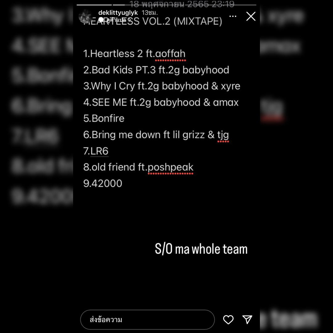 เมื่อวันที่ 18 พ.ย. 2565 | UGLY K เผยภาพปกอัลบั้มใหม่ “HEARTLESS VOL.2” พร้อม Track List 9 ผลงานเพลงที่ได้ AOFFAH,2G BABYHOOD,LIL GRIZZ,XYRE,AMAX,TJG และ POSHPEAK พร้อมปล่อยให้ฟังพร้อมกันในวันพรุ่งนี้ (20 พ.ย. 2565)