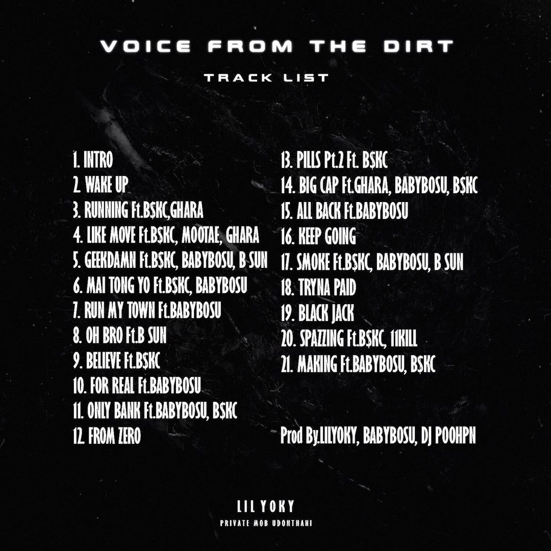 LIL YOKY ฟังได้แล้วตอนนี้ 21 ผลงานเพลง จากอัลบั้ม “VOICE FROM THE DIRT” • 11KILL • B$KC • GHARA • MOOTAE • BABYBOSU • B_SUN